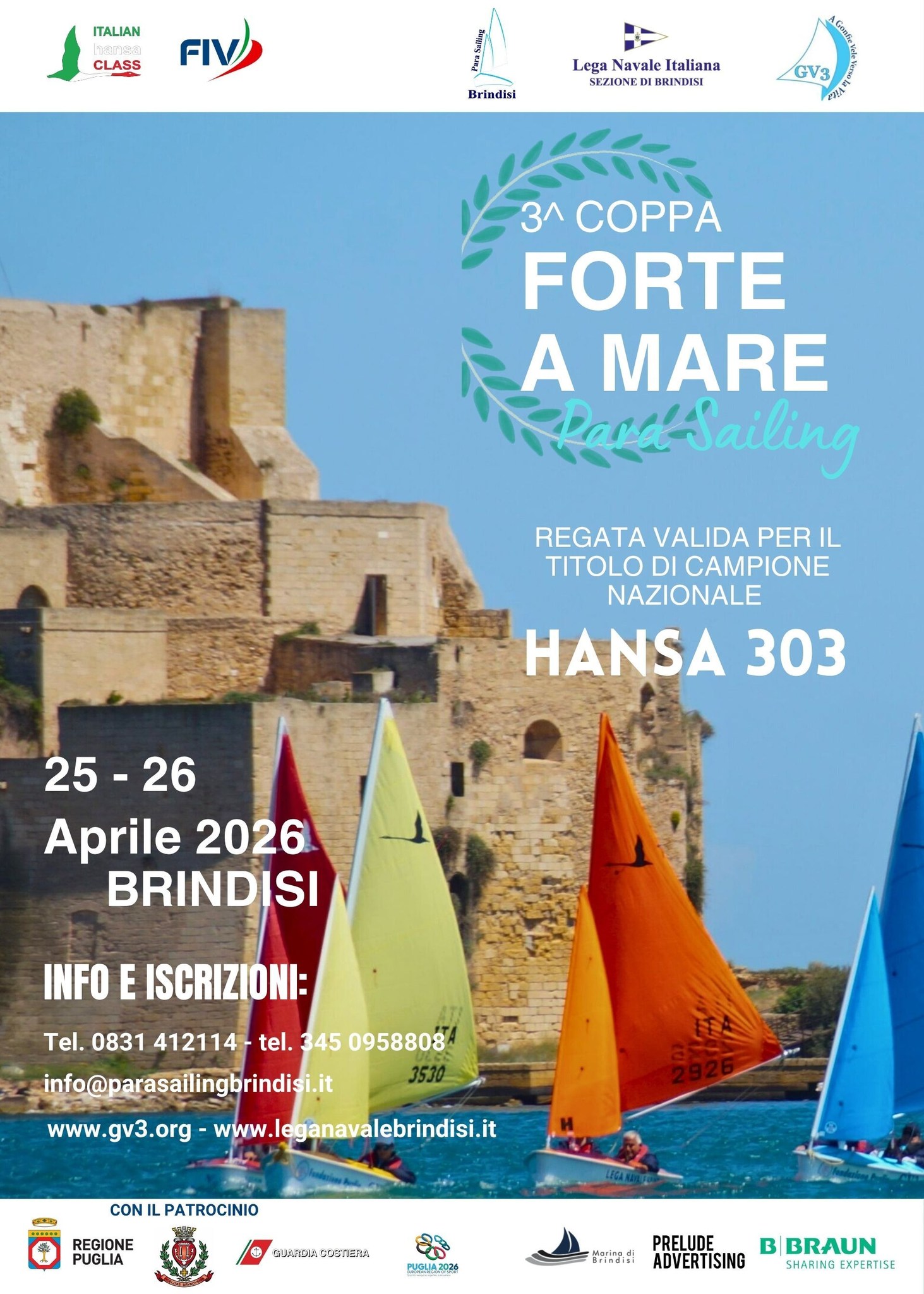 Torna indietro 3^ Coppa Forte a Mare Sei qui: Home / Regate / 3^ Coppa Forte a Mare Date: dal 24/04/2026 al 26/04/2026 Circolo organizzatore: GV3 - A Gonfie Vele Verso la Vita - APSSD Classi coinvolte: Altre classi Circoli in collaborazione: Localitą: Brindisi Mare: Adriatico Nomine U.D.R. Lettera di Nomina 3^ Coppa Forte a Mare Comunicati C.O. Comunicati C.d.R. Comunicati C.d.P. Condividi con