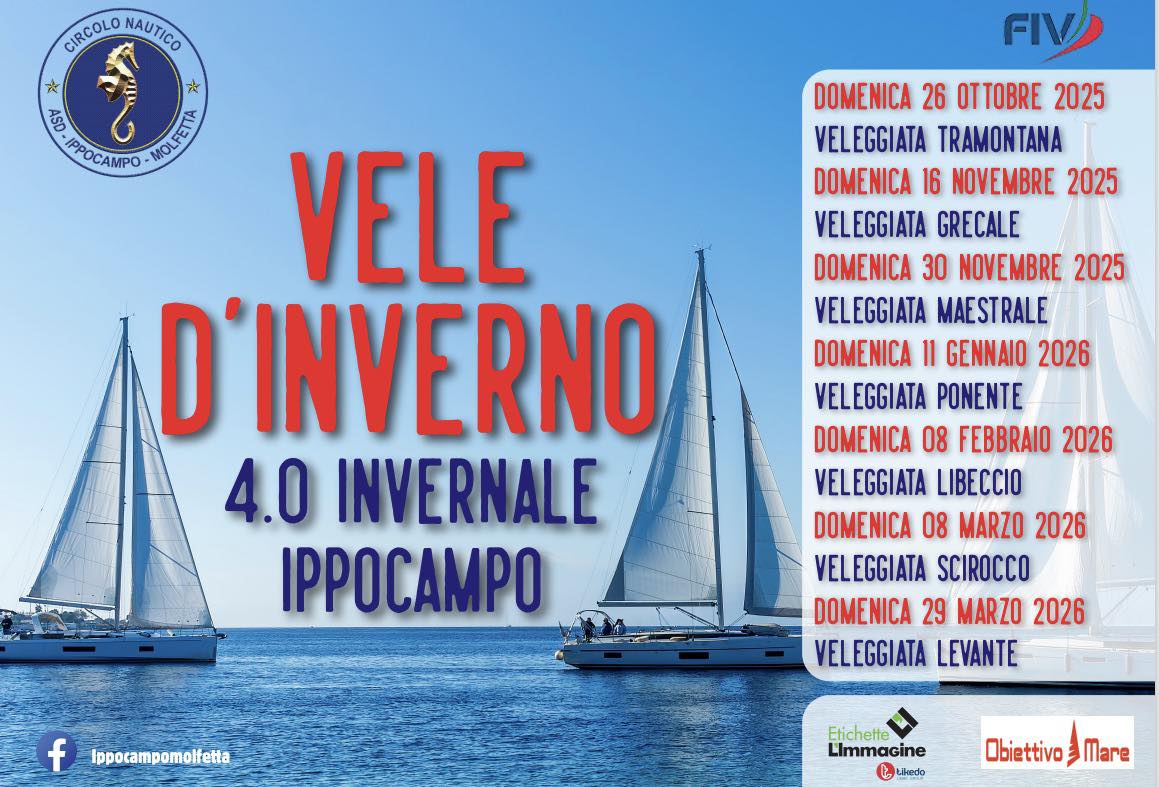 Torna indietro Vele d'Inverno - Veleggiata Scirocco Sei qui: Home / Regate / Vele d'Inverno - Veleggiata Scirocco Date: dal 08/03/2026 al 08/03/2026 Circolo organizzatore: Circolo Nautico Ippocampo Classi coinvolte: Circoli in collaborazione: Localitą: Molfetta Mare: Adriatico Nomine U.D.R. Comunicati C.O. Comunicati C.d.R. Comunicati C.d.P. Condividi con